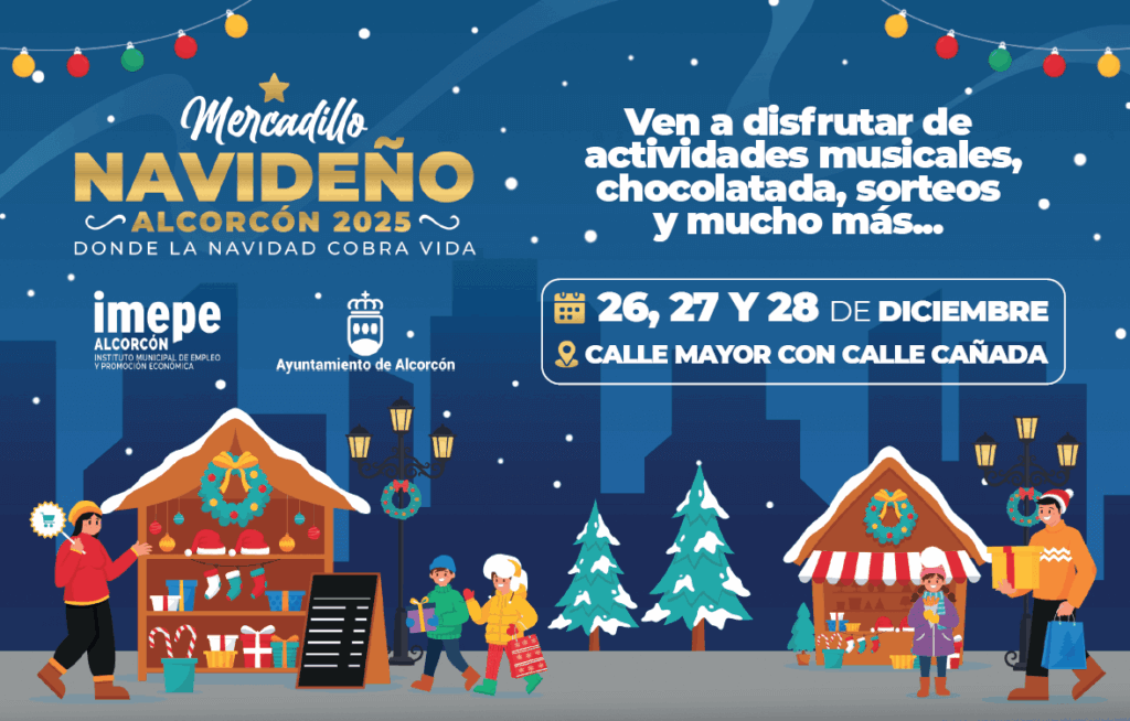 El próximo 26, 27 y 28 de diciembre se celebrará un MERCADILLO NAVIDEÑO en la C/mayor a la altura de C/Cañada en donde 22 casetas con otros tantos establecimientos ofrecerán distintos productos siendo una oportunidad para los vecinos y vecinas de Alcorcón para acercarse y realizar sus últimas compras navideñas.